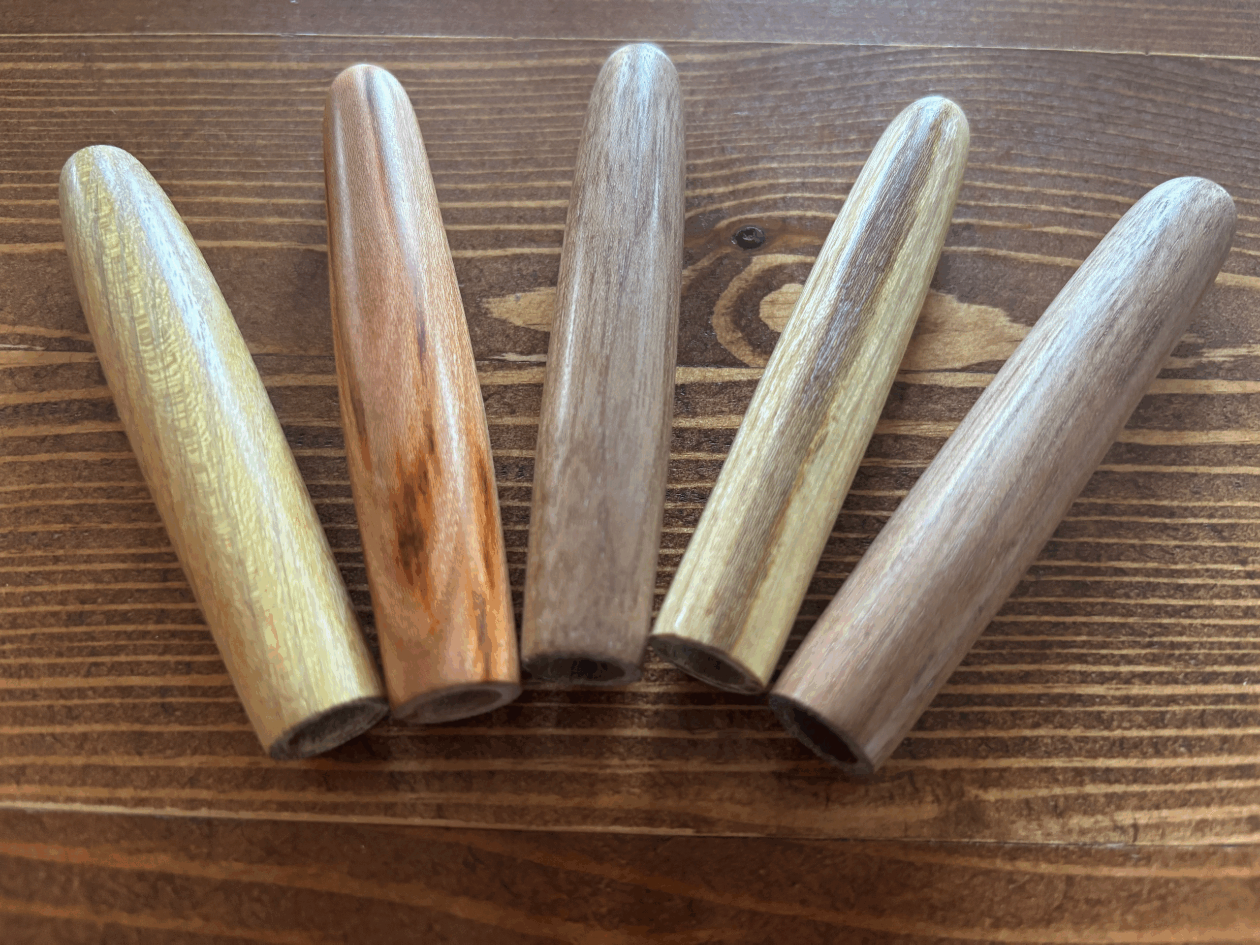 Vyhledávám dřevo, které je něčím nezvyklé: větve s jizvami, sudky ze švestek, padlé akáty z mezí. Nesnažím se je „vylepšit“, jen je vést – pod rukama, dlátem, smirkem. Každé pero si najde svůj tvar samo.